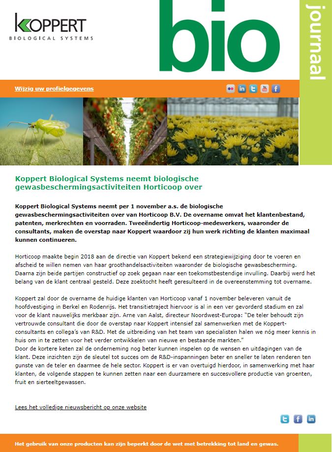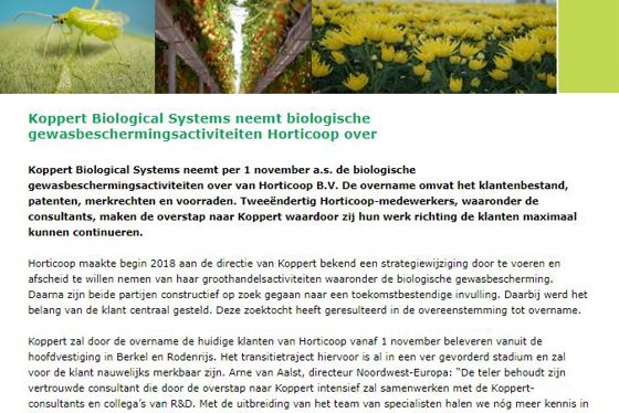Koppert Biological Systems neemt per 1 november a.s. de biologische gewasbeschermingsactiviteiten over van Horticoop B.V.