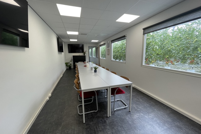 Voor kleinere groepen tot 15 personen biedt onze Meetingroom een ideale, sfeervolle setting voor brainstormsessies, vergaderingen of workshops. Deze comfortabele ruimte met airconditioning en een prachtig uitzicht op de tomatenplanten geeft jouw bijeenkomst een groene, inspirerende achtergrond, perfect om nieuwe ideeën te laten groeien.